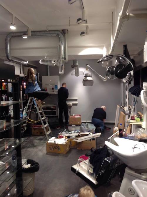 Før bilde. Alle mann i arbeid! :-) Vi driver å rydder og pakker bort salongen.