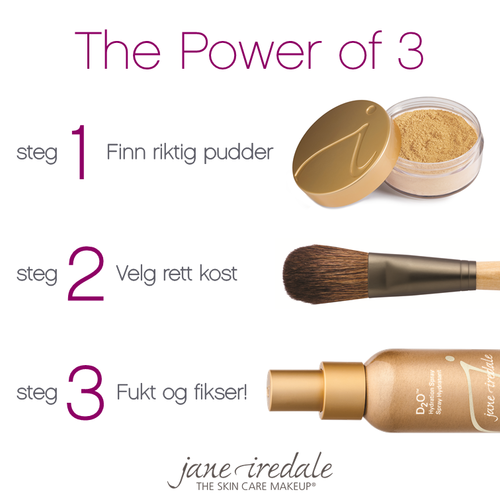 Produktene er basert på de reneste og beste ingrediensene, med mineraler og planteekstrakter som er nøye utvalgt på grunn av sin gode produktkvalitet og hudpleiende egenskaper. Våre mineralpudder vil gjøre livet ditt enklere fordi du får både concealer, foundation, UV-beskyttelse og pudder i ett og samme produkt.The Power of Three – kombinasjonen av primer, pudder og fuktspray tilpasset din hud – sikrer deg en naturlig finish og en holdbar makeup hele dagen.